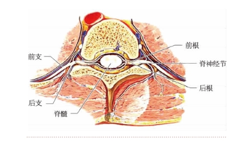每条脊神经干都由前根和后根在椎间孔处合成。前根含传出纤维(运动纤维),由脊髓灰质的运动神经元发出的神经纤维构成;后根有一膨大的脊神经节,节内含感觉神经元的胞体,其中枢突组成后根,周围突构成脊神经的传入纤维(感觉纤维)。可见,每条脊神经都是含有传入纤维和传出纤维的混合神经(图12-2-2)。