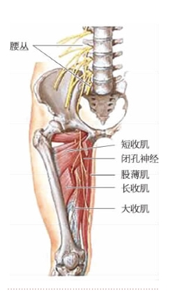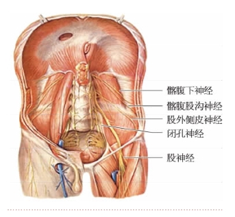 (2)闭孔神经:闭孔神经自腰大肌内侧缘穿出,贴盆腔侧壁内面前行,穿出盆壁后至大腿内侧,分前、后两支分布于大腿内侧群肌和大腿内侧的皮肤(图12-2-19)。