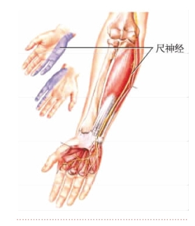 尺神经的肌支分布于前臂前群一块半肌、手掌内侧和中间肌群。其皮支分布于手掌尺侧1/3、尺侧1个半指的皮肤和手背尺侧半、手背尺侧2个半指的皮肤(图12-2-12)。尺神经损伤易发生在肱骨下端尺神经沟处,如肱骨内上髁骨折易损伤尺神经,引起“爪形手”(图12-2-11)。