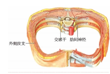 肋间神经肌支分布于肋间内、外肌和腹前外侧壁诸肌,皮支分布于胸壁、腹壁的皮肤及胸膜、腹膜的壁层(图12-2-14)。