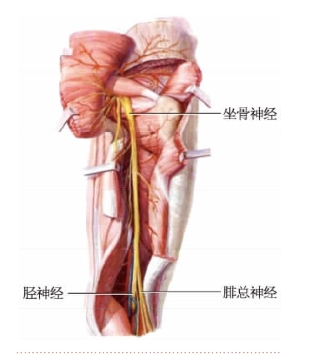 坐骨神经:是全身最粗大的神经。自梨状肌下孔出盆腔后,经臀大肌深面、大转子与坐骨结节之间下降达股后区,从股后群肌深面下降至腘窝上方,分为胫神经和腓总神经(图12-2-22)。坐骨神经本干在股后区分布于股后群肌和髋关节。