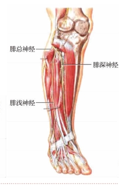 2)腓总神经:腓总神经沿腘窝上外侧缘下降(图12-2-25),绕腓骨颈外侧向前达小腿前面,分为两支:一支为腓浅神经,下行于腓骨长、短肌之间,并支配此二肌,在小腿中、下1/3交界处浅出,分布于小腿前外侧、足背及第2~5趾背面的皮肤;另一支为腓深神经,下行于小腿前群肌深面,经踝关节前方至足背,支配小腿前群肌,分布于足背肌和第1~2趾背相对缘的皮肤。