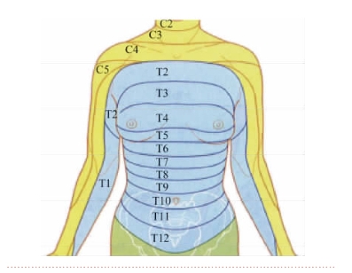 图12-2-15 胸神经前支的皮支节段性分布(蓝色区域所示)