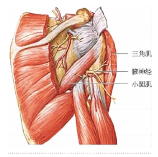 (1)腋神经:腋神经自臂丛发出后绕肱骨外科颈至三角肌深面(图12-2-6、图12-2-8)。肌支支配三角肌,皮支分布于肩部和臂外侧上部皮肤。肱骨外科颈骨折、肩关节脱位时易损伤腋神经,形成“方肩”。