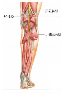 1)胫神经:胫神经为坐骨神经本干的直接延续。沿中线下行入腘窝,与腘血管伴行,穿至小腿比目鱼肌深面下行,至内踝后方分为足底内侧神经和足底外侧神经(图12-2-23)。胫神经主要分布于小腿后群肌及足底肌、小腿后面和足底皮肤。