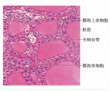 甲状腺表面包有薄层结缔组织被膜,结缔组织伴随着血管和神经深入实质内。实质被结缔组织分隔成若干小叶,内有许多甲状腺滤泡,滤泡上皮由单层立方上皮围成,滤泡腔内充满透明的胶质。滤泡上皮细胞是甲状腺激素合成与释放的部位。甲状腺激素主要有甲状腺素,又称四碘甲腺原氨酸(T4)和三碘甲腺原氨酸(T3)两种。T4数量远远超过T3,因此甲状腺分泌的激素主要是T4,约占总量的90%以上。T3的分泌量较少,但T3的生物活性比T4约大5倍。甲状腺激素合成的原料有碘和甲状腺球蛋白。甲状腺滤泡间有少量结缔组织、丰富的毛细血管和滤泡旁细胞(图13-3-2)。滤泡旁细胞又称C细胞,细胞较大,在HE染色中胞质着色较浅。滤泡旁细胞可以分泌降钙素,使血钙浓度降低。