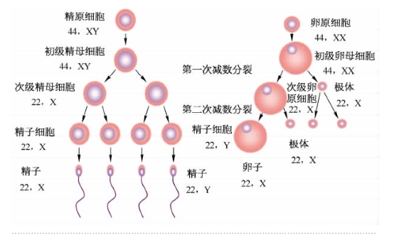 从青春期开始,在垂体促性腺激素的影响下,睾丸的精曲小管中不断地有一部分精原细胞分化发育成初级精母细胞。每个初级精母细胞,经两次成熟分裂后形成4个精子,其中两个精子的染色体是23,X,另两个精子的染色体是23,Y(图14-1-1)。