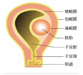 胚泡植入后的子宫内膜称为蜕膜。蜕膜分三部分:位于胚泡深面的子宫内膜,称基蜕膜;覆盖在胚泡表面的子宫内膜称包脱膜;基蜕膜、包脱膜以外的部分称壁蜕膜。包脱膜与壁脱膜之间为子宫腔。随着胚胎的发育,包蜕膜逐渐凸向子宫腔,子宫腔变窄、消失,包蜕膜和壁蜕膜贴合(图14-2-4)。