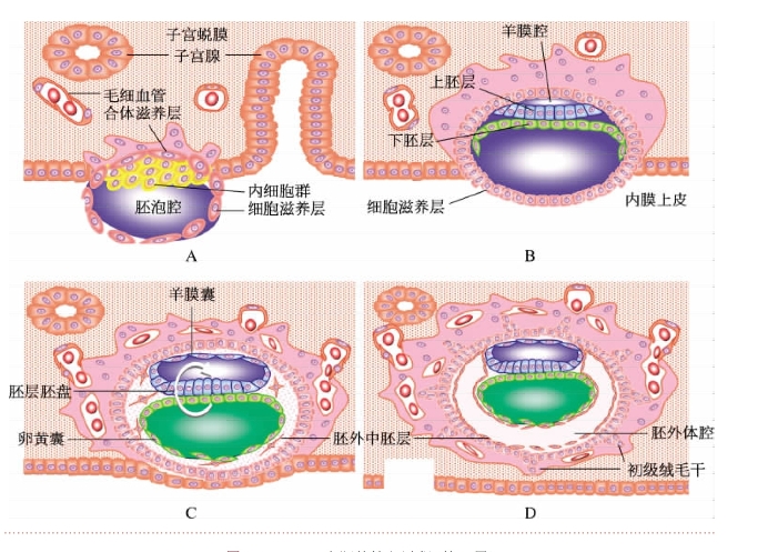 植入时,内细胞群一侧的极端滋养层首先与子宫内膜接触并分泌蛋白水解酶,溶解子宫内膜,形成一缺口,胚泡由此埋入子宫内膜功能层。随着胚泡的埋入,缺口周围的上皮增生,修复缺口,植入完成(图14-2-2)。