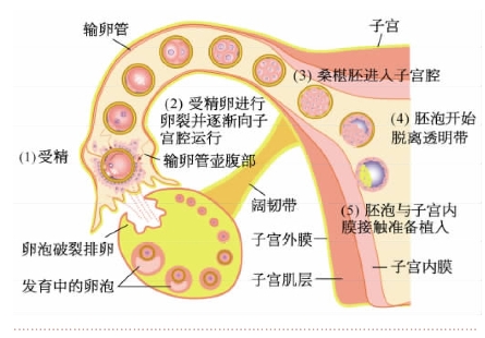 图14-2-3 排卵、早期胚的发生及其与女性生殖道关系模式图