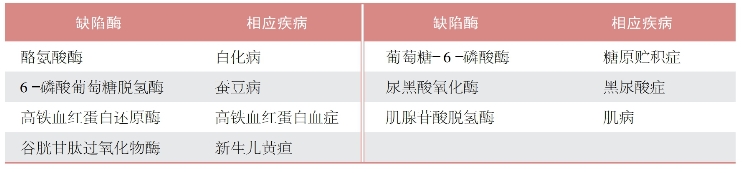 1.酶与疾病的发生 临床上有些疾病的发病机制是由酶的质和量的异常或酶活性受抑制所致的:①酶缺陷所致的疾病,多见于先天性或遗传性疾病(表15-1-3)。②酶活性异常所致的疾病,许多中毒性疾病实际上是体内某些酶活性被抑制所引起的。例如,有机磷农药抑制胆碱酯酶活性,一氧化碳抑制细胞色素氧化酶活性等,均可引起中毒。