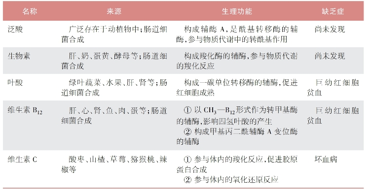 表15-1-5 水溶性维生素的名称、生理功能、缺乏症