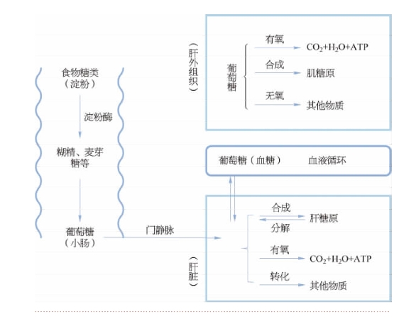 1.糖原的生成作用 糖原是由许多葡萄糖分子缩合而成的多糖,是储存糖的主要形式。体内由葡萄糖合成糖原的过程称糖原生成作用。糖原的生成是耗能过程。机体各组织能利用葡萄糖合成糖原,但各组织中糖原含量并不相同。肝脏和肌肉是储存糖原的主要器官,脑组织糖原储备非常少,必须不断地从血液中摄取葡萄糖来维持代谢的需要。