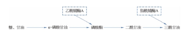 α-磷酸甘油主要由糖代谢过程生成的磷酸丙糖转变而来。脂酰辅酶A来源于:①体内一部分现存脂肪酸可被激活转变成脂酰辅酶A。②以乙酰辅酶A为原料逐步缩合生成。乙酰辅酶A来源广泛,糖代谢和脂肪代谢都能产生,但主要来自糖。在细胞的内质网中α-磷酸甘油被脂酰辅酶A逐步酯化合成三酰甘油。