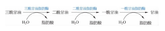 1.脂肪的水解 脂肪组织中贮存的脂肪,在脂肪酶的催化下逐步水解为脂肪酸和甘油,并释放入血液运往全身其他组织被利用,这个过程称脂肪的水解,亦称脂肪动员。水解过程如下。