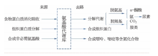 体内游离氨基酸分布在血液和组织中,构成氨基酸的代谢库。正常情况下,代谢库内氨基酸的来源与去路处于动态平衡。氨基酸在体内代谢情况见图15-4-1。代谢库中氨基酸的主要来源是食物蛋白质的消化吸收,最主要的去路是合成机体的组织蛋白。