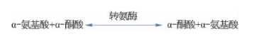 2.转氨基作用 是指α-氨基酸的氨基通过氨基转移酶(又称转氨酶)的催化,转移到α-酮酸的酮基上,生成相应的氨基酸,而原来的α-氨基酸则转变成相应的α-酮酸。此反应可逆,是体内合成非必需氨基酸的又一种方法。