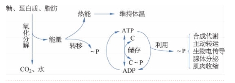 体内最主要的高能磷酸化学物是三磷酸腺苷(ATP)。机体利用ATP分解产生的能量合成各种细胞组成分子、各种生物活性物质和其他一些物质;进行各种离子和其他一些物质的主动转运,维持细胞两侧离子浓度差所形成的势能;肌肉还可利用ATP所载荷的自由能进行收缩和舒张,完成多种机械功(图15-6-1)。