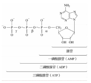 ATP分子结构中含有两个高能磷酸键,习惯上以“~”表示,即指ATP水解时β、γ磷酸酯键断裂能释放的能量多达30.54 kJ/mol。含这种高能键的化合物称高能化合物。ATP不仅是核酸合成的原料,更是体内最重要的能量载体,可储存、传递化学能。其他的GTP、CTP、UTP等也是高能磷酸化合物。