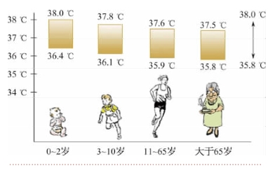 (3)年龄差异:不同年龄的人,能量代谢不同,体温也不同。一般来说,儿童高于成人,成人体温高于老年。新生儿,由于体温调节中枢和调节机制发育不完善,调节体温的能力差,易受环境变化的影响。而老年人对外界环境变化的适应能力差、代谢低、体温低,发热时,可不见体温升高。因此,在临床工作中,要特别重视老年人和新生儿的体温特点,并注意老年人和新生儿的护理和保温。