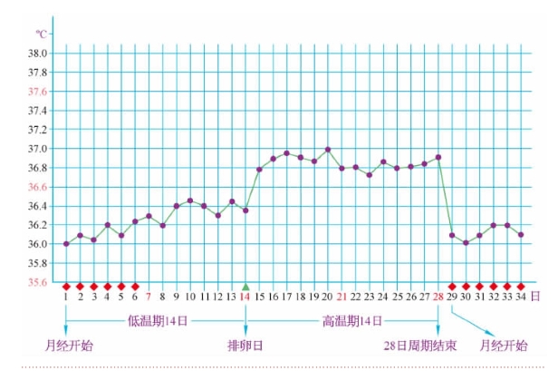 (2)性别的差异:青春期开始后,女性基础体温平均比男性高0.3℃,而且随月经周期发生规律性变化。月经期的平均温度最低,随后轻度升高,排卵日又降低,排卵后体温升高(0.2~0.5℃),并保持较高水平直至下次月经到来(图15-6-2)。因此,测定成年女性基础体温的变化可以判断其排卵的日期以及有无排卵。