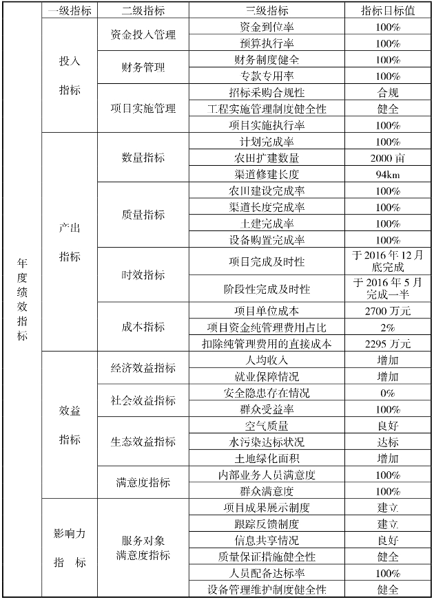 投入指标:从预算投入、配套资金情况、财务管理、实施管理几个方面进行考核,分别设置目标。