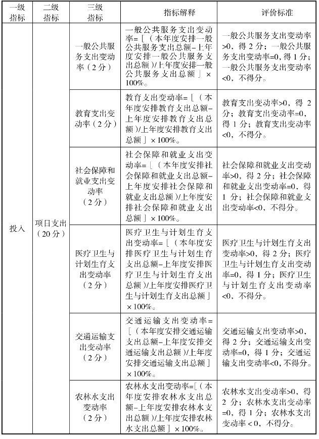以预算支出中的一般公共服务支出、教育、社会保障和就业、医疗卫生与计划生育、交通运输、农林水、城乡社区、科学技术等9项重点支出的变动情况为评价内容,反映项目实施的整体资金保障情况。