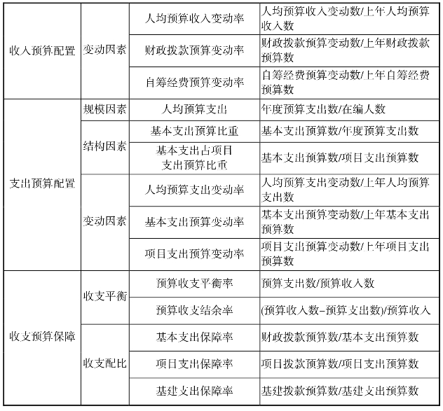 影响收入预算配置绩效的规模、结构与变动因素指标均围绕人均预算收入、财政拨款和自筹经费预算数展开。人均预算收入与变动率既反映了预算整体水平,又蕴涵了对预算单位事业发展能力的认可程度;财政拨款和自筹经费比重以及变动率则是对多渠道筹集资金能力的考核。支出配置绩效的评价按照支出预算类别细化,人均预算支出、基本支出(人员支出与公用支出)、项目支出的规模与变动指标是从总量和分量角度衡量的支出预算水平,也是贯彻“增收节支”绩效理念的外延。基本支出预算比重考核预算编制是否首先确保基本支出;人员支出与项目支出比重评价基本支出和项目支出预算优先安排人员支出的水平。收支预算保障绩效主要是考虑收支平衡与配比因素,前者由预算收支平衡率和结余率组成,旨在评价预算编制是否做到收支平衡,有所结余;后者涵盖基本支出、项目支出保障率,用于考核财政拨款预算对基本支出、项目支出的保障程度,也有助于在预算执行过程中把握组织收入与节约支出的重点。