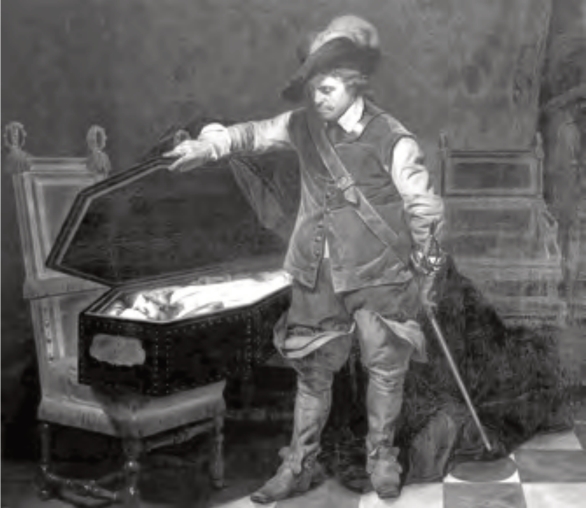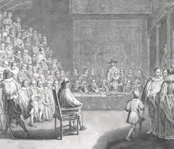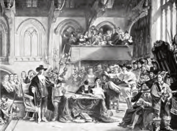 奥利弗·克伦威尔跑到窗前,看着查理一世从花园里走过来。奥利弗·克伦威尔的脸变得像墙一样白……然后转向委员们说:“先生们,他来了,他来了。现在我们正在进行一项全国瞩目的伟大工作。在查理一世到来之前,我们要做出决定,我们应当如何回答他的问题,因为他问我们的第一个问题将是我们以什么样的权力和名义审判他。”一时间,无人回答。过了一会儿,亨利·马滕站起来说:“以下议院和英格兰所有善良人民的名义。”