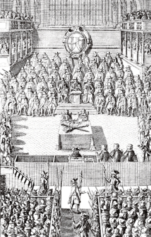 1649年1月20日13时左右,法庭休会,转到威斯敏斯特大厅。在大厅靠南的地方,用一个新建的木制平台覆盖了原来由大法官法庭和国王法庭占据的所有空间。一个高出平台地面约三英尺的木隔板将法庭分隔开来。平台隔板的那一边有一个用木栅栏围起来的宽阔的过道。穿过整个大厅,还有一条同样的过道沿着大厅一直通向大门。在过道两旁,一排火枪手和长矛兵背对栅栏站着,军官在过道中间来回巡视。观众都站在大厅两侧及过道之间的栅栏围起来的地方。在大厅两边的上方有两层小游廊,留给特殊观众。法庭后端靠近大窗户的地方有四五层铺着朱红色毯子的板凳,七十名审判官就坐在那里。他们穿着常服。奥利弗·克伦威尔和亨利·马滕坐在后排,座位的标牌两边刻着共和国徽章。法庭审判长萨金特·约翰·布拉德肖坐在前排中间的一张垫高的桌子前,他的助手约翰·莱尔和威廉·赛伊坐在两侧,他们都身穿黑色律师服。在法庭的中间有一张桌子,两名办事员坐在那里,桌子上放着国家权杖和剑。在法庭的前面,平台的边缘有三个隔间,有点像靠背长椅,背面是由分隔法庭和大厅的隔板做的。中间的那个隔间里放着一张淡红色天鹅绒的圈椅,还有一张铺着土耳其毯子的小桌子,桌上放着一瓶墨水和一张纸,查理一世就坐在这里。查理一世右边的隔板边上坐着三名律师,他们是共和国的法律顾问。查理一世的脸转向了审判长,背对着大厅里的人群。由于法庭的地板比大厅的地板高,观众们好像是站在剧院的下沉观众席里。隔墙多少挡住了他们看向法庭内部的视线,但他们可以看到露出隔板外的查理一世的头和肩膀。