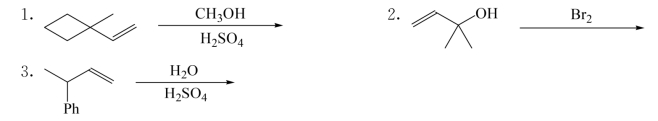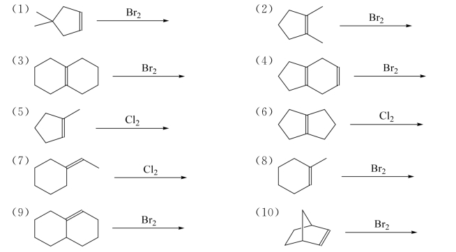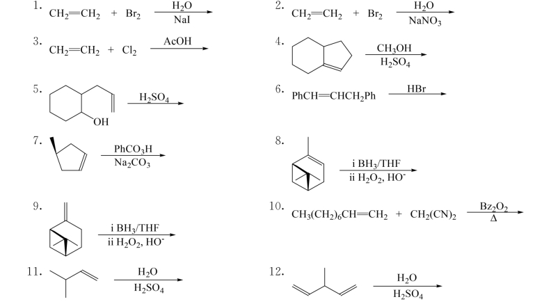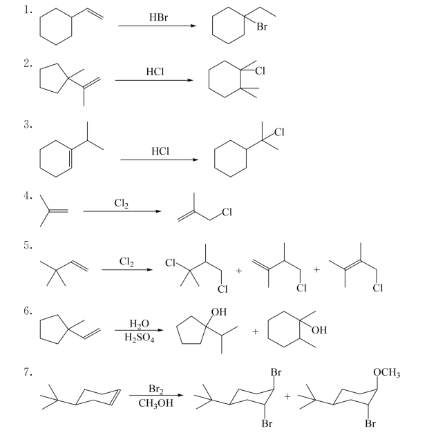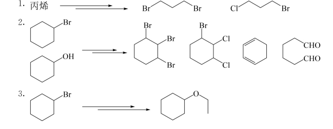 2.化合物A(C7H12)与高锰酸钾作用后,得到环己酮.A用酸处理转化成B,B与溴作用,生成化合物C,C与氢氧化钾乙醇溶液共产生D,后者经臭氧化-还原水解,给出丁二醛和丙酮醛.试推导A~D的结构.