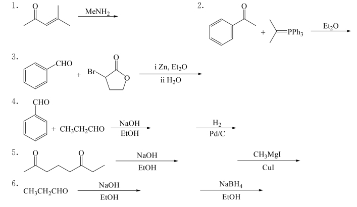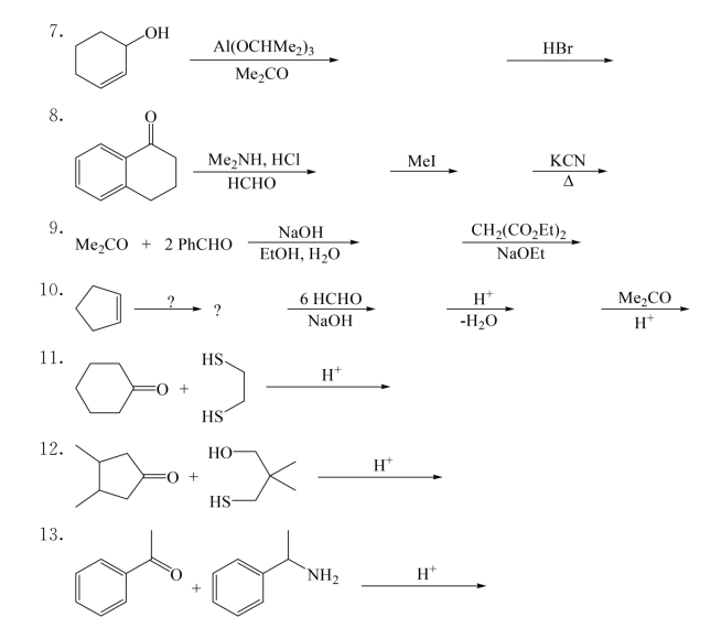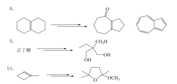 9.化合物A(C7H12O)与甲基碘化镁反应、酸化后得到化合物B(C8H16O),后者与硫酸氢钾共热得到异构体C和D的混合物(C8H14).C还能通过A和亚甲基三苯基膦反应制得.D经臭氧还原分解得到E(C8H14O2),E经湿的氧化银处理转化为F(C8H14O3),F用溴的氢氧化钠溶液处理、酸化得到3-甲基己二酸.试推导A~F的结构并写出相应的反应.
