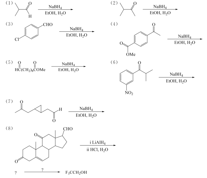 7.化合物A(C10H12O2)不溶于氢氧化钠水溶液,对氨基脲呈阳性,但对Tollens试剂显阴性.A经硼氢化钠处理转化为B.A和B都使碘的氢氧化钠溶液产生黄色沉淀.A与氢碘酸作用产生C(C9H10O2),溶于苛性碱但不溶于稀碳酸钠.C与水合肼及氢氧化钾在乙二醇中回流得到D(C9H12O).B经高锰酸钾氧化给出E:νmax3 300~2 500,1 688(s)cm-1;δH12.7(s,1 H),7.93~7.04(dd,4 H),3.84(s,3 H)ppm.试给出A~C的结构.