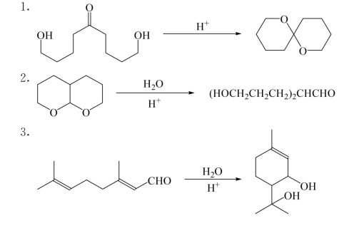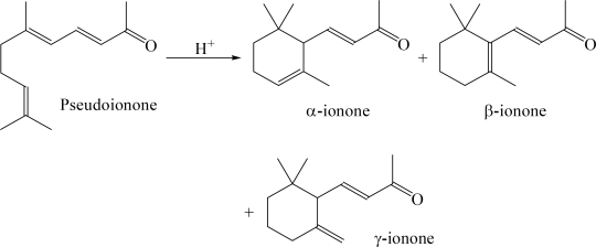 5.假紫罗兰酮(pseudoionone)在酸作用下转化成罗兰酮(ionones)并有三个异构体(α-ionone,β-ionone和γ-ionone),给出合理的机理.
