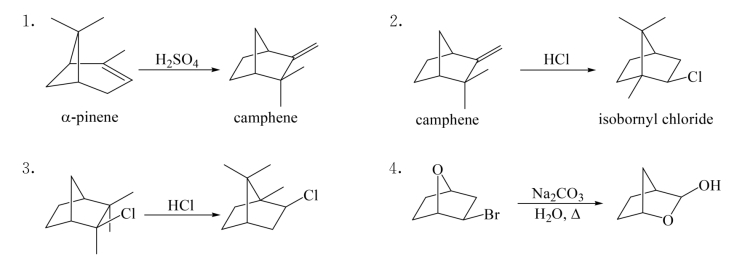 Wagner-Meerwein重排是一种碳正离子重排,伴随着氢或烃基(烷烃基或芳烃基)的迁移(大多是1,2-迁移),首先在双环萜类化合物异冰片转化为莰烯的反应中发现(Georg Wagner,1899;Hans Meerwein,1914),事实上普遍存在于萜类化合物中,后来推广到烯、醇、卤代烷等的碳正离子重排.Wagner-Meerwein重排反应的推动力是较不稳定的碳正离子转化为较稳定的碳正离子.这里给出几个典型的例子,试建议机理.