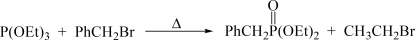 苯溴甲烷与亚磷酸乙酯受热发生Arbuzov重排,生成苯甲基膦酸乙酯和溴乙烷.与亚磷酸酯的双分子亲核取代反应,溴乙烷的活性不如苯溴甲烷的高,所以是苯溴甲烷继续与亚磷酸酯反应,直至消耗完全.