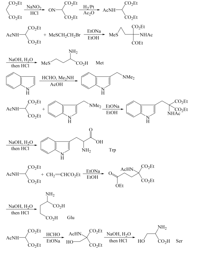 3.利用乙酰氨基丙二酸酯法合成:蛋氨酸、色氨酸、谷氨酸和丝氨酸.