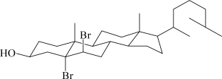 胆甾醇是多手性碳原子的分子,加成溴的反应产物必然是非对映异构体.加成主要产物是:A/B环处于反式,两个溴原子都处于a键.
