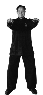 身体自然站立。两膝微屈,松胯收臀,向左开步,两脚与肩同宽。两手上领与肩同高,下按至胯前,同时重心下沉,两膝微曲至开始练拳的高度(如图1 至图4 所示)。