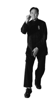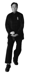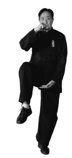 3. 右拳上提,同时提右腿成左独立步,然后右脚下震,内气贯注全脚,同时右拳落于左掌内,重心在左脚(如图9、图10 所示)。
