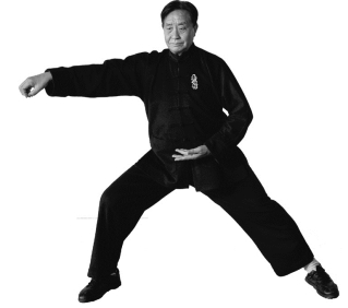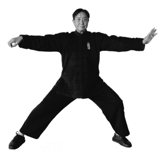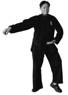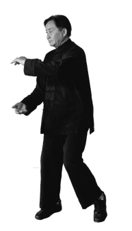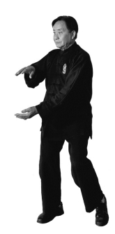 3. 重心左移,同时左手上转向左,掌心向前(如图6、图7 所示)。同时沉肘松肩,重心不变,成外三合定式。
