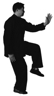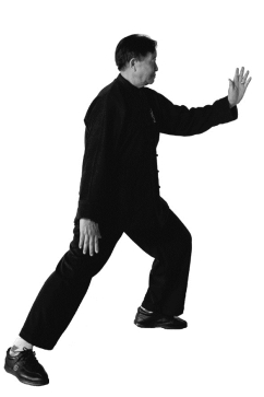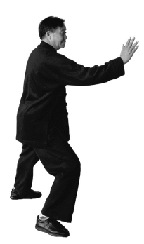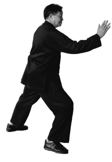 2. 重心移左,右手前划弧向下往后到右侧,左手划弧从后向上向前推按,同时松左胯成左弓步(如图3、图4 所示)。