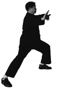 1. 腰向左转,双手右顺左逆随转,右手转于胸前,左手转于左胯侧,重心不变。腰向右转同时左手变顺缠向上划弧于胸前,同时右手变逆缠向下划弧于右胯侧,重心移右(如图1、图2 所示)。