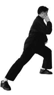 3. 右弓步前移成左弓步,同时左手向下划弧于膝前变勾手提于肩平,右手变顺缠屈肘转于右耳侧,重心不变(如图5、图6 所示)。