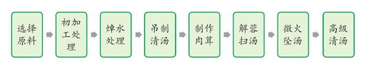 制作高级清汤应注意:第一,原料要新鲜。第二,火候要拿稳,无论吊汤还是坠汤,均先用旺火烧开,使原料中的血红蛋白凝结浮出汤面,有利于拣尽浮沫,保持汤汁的澄清;然后改用微火,使汤汁处于微沸状态,让原料中的呈鲜物质最大限度地渗出,从而增强汤汁的鲜醇和香味。第三,一次加够水,中途不另添水,保持原汁原味。