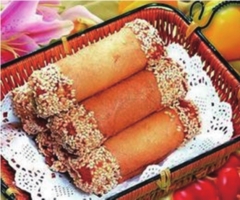 ⑤面包卷的两边沾一点鸡蛋液,然后沾上芝麻。