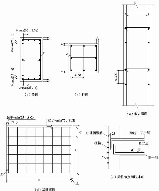 采用包筋原则,即“主(柱)包客(梁)、负包正、一包二”。包筋净距≥max(25,d),其中主与客的关系如下:柱筋进入梁区,梁为主,柱为客,柱筋在内侧,伸至梁顶,离梁的顶部纵筋净距≥max(25,d),并同时满足锚固要求;梁筋锚入柱中,梁为客,柱为主,梁的负筋伸至柱筋内侧,离柱外侧纵筋净距≥max(25,d),并同时满足锚固要求;主梁与次梁相互垂直,纵筋可以相互接触。如图0.3(e)所示。