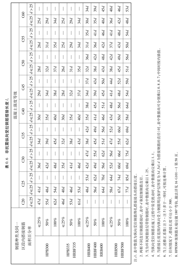 ④受拉钢筋绑搭接头长度根据抗震与非抗震情况直接查表得出,见表0.6。