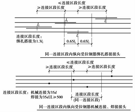 b.受拉、受压纵筋直径d>25mm时,不宜采用绑搭接头,当有抗震要求时,宜采用焊接和机械连接。轴心和小偏心受拉构件的纵向受力钢筋不得采用绑搭接头。