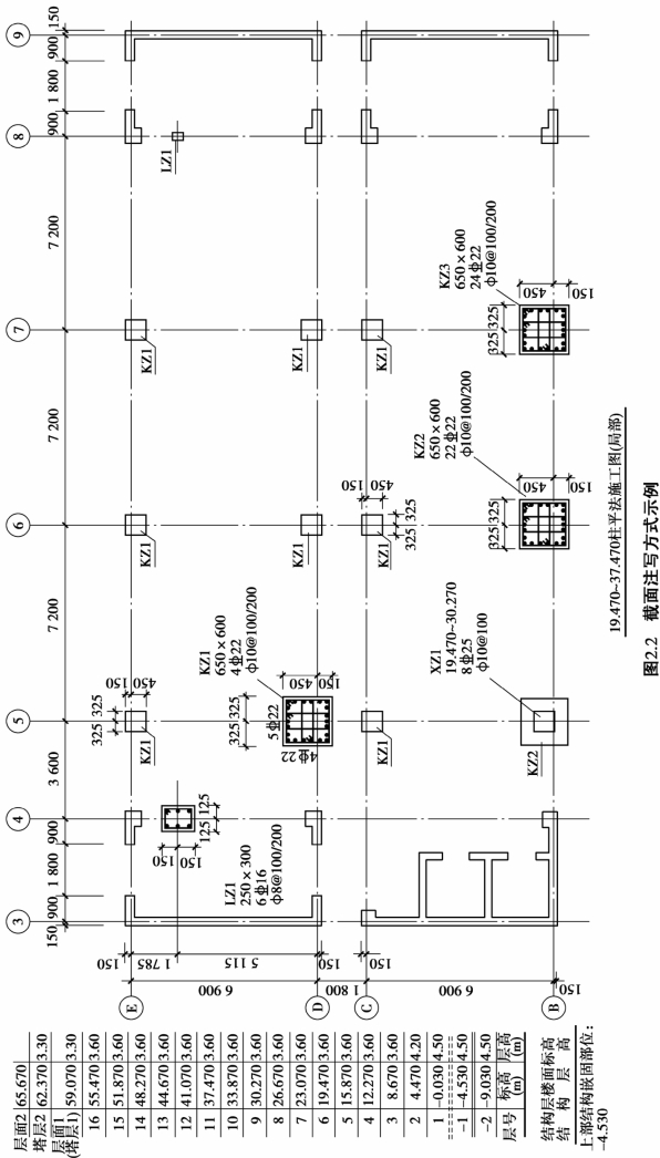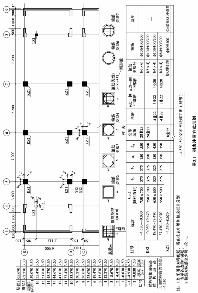 柱构件列表注写,必注值包括柱编号、截面尺寸、起止标高、纵筋配筋(包括角筋和中部纵筋)、箍筋配筋及箍筋类型号与肢数(见图2.4)。